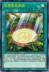 相手のフィールドゾーンに「世界恐龙摔跤」が表側表示で存在し、『①:自分フィールドに「恐龙摔跤手」モンスターが存在する場合、お互いのプレイヤーはバトルフェイズにモンスター1体でしか攻撃できない』効果が適用されています。
