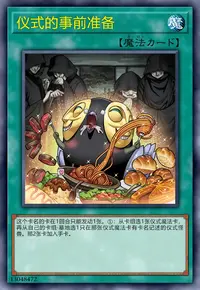 「仪式的事前准备」の『①:デッキから儀式魔法カード1枚を選び、さらにその儀式魔法カードにカード名が記された儀式モンスター1体を自分のデッキ・墓地から選ぶ。そのカード2枚を手札に加える』効果によって、デッキから「混沌形态」を手札に加えました。
