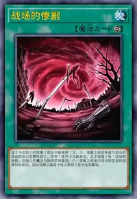 ①:怪兽之间没有进行战斗的回合的自己主要阶段2,丢弃1张手卡才能发动。从卡组选1张「战场的惨剧」在自己的魔法与陷阱区域盖放。
