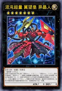 这张卡也能在自己场上的「混沌No.101」~「混沌No.107」其中任意种的「混沌No.」怪兽上面重叠来超量召唤。这个卡名的②的效果1回合只能使用1次。