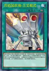 这张卡把自己场上表侧表示存在的1张「烈焰加农炮」送去墓地才能发动。此外,自己的主要阶段时,选择对方场上1只怪兽才能发动。从手卡把1只炎族怪兽送去墓地,选择的对方怪兽破坏并给与对方基本分500分伤害。这个效果发动的回合,自己怪兽不能攻击。