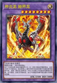 ①:这张卡融合召唤的场合,丢弃1张手卡才能发动。自己的场上·墓地·除外状态的怪兽作为融合素材回到卡组,把除「神炎龙 赫界龙」外的1只8星以下的融合怪兽融合召唤。这个回合,这张卡不能攻击,自己不是融合怪兽不能从额外卡组特殊召唤。