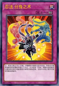 ①:把自己场上1只「忍者」怪兽解放才能把这张卡发动。等级合计最多到解放的怪兽的等级以下为止,从卡组选「忍者」怪兽任意数量各以表侧攻击表示或者里侧守备表示特殊召唤。这张卡从场上离开时那些怪兽全部破坏。