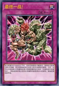 自己的基本分1000分以下时,在对方的回合才能发动。选择自己的场上的1只怪兽,双方的其他的场上和手上的卡全部送去墓地。之后,对方从卡组选择1只怪兽攻击表示特殊召唤并进行战斗(玩家的战斗伤害为0)。回合结束时场上还存在怪兽的玩家获得决斗的胜利。其他的情况算平局。