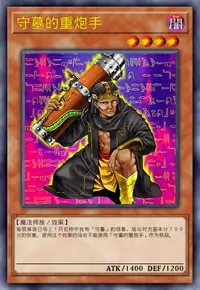 每祭掉自己场上1只名称中含有「守墓」的怪兽,给与对方基本分700分的伤害。使用这个效果的场合不能使用「守墓的重炮手」作为祭品。