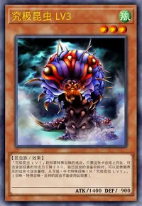 「究极昆虫 LV1」的效果特殊召唤的场合,只要这张卡在场上存在,对方全部怪兽的攻击力下降300。自己回合的准备阶段时,可以把表侧表示的这张卡送去墓地,从卡组·手卡特殊召唤1只「究极昆虫 LV5」。(召唤·特殊召唤·反转的回合不能使用此效果)