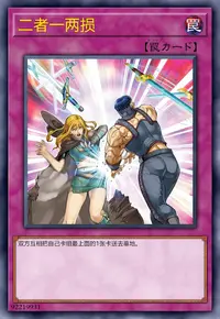 自己场上表侧表示存在的怪兽破坏送去墓地时发动。场上表侧表示攻击力最低的1只怪兽破坏,双方受到那个攻击力一半的数值的伤害。