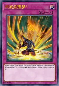 选择自己墓地1只名字带有「六武众」的怪兽才能发动。选择的怪兽从墓地特殊召唤。这个效果特殊召唤的怪兽在这个回合的结束阶段时破坏。