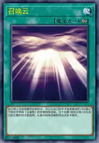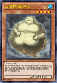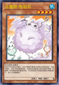 这张卡被战斗破坏送去墓地时,在自己场上把2只「云魔物衍生物」(天使族·水·1星·攻/守0)守备表示特殊召唤。这些衍生物不能作为名字带有「云魔物」的卡以外的祭品召唤的祭品。