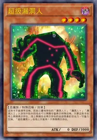 这张卡不能通常召唤。把自己墓地存在的「漏洞人X」「漏洞人Y」「漏洞人Z」从游戏中除外的场合可以表侧守备表示特殊召唤。只要这张卡在场上表侧表示存在,场上表侧攻击表示存在的全部怪兽的攻击力·守备力交换。「超级漏洞人」在场上只能有1只表侧表示存在。