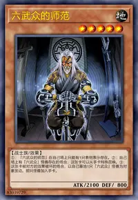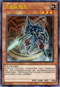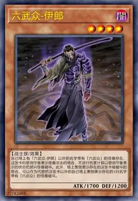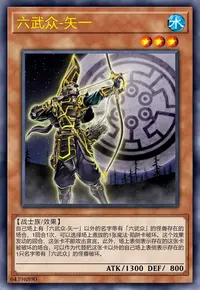 这张卡不能通常召唤。把自己墓地2只名字带有「六武众」的怪兽从游戏中除外的场合才能特殊召唤。1回合1次,可以选择场上表侧表示存在的1只怪兽破坏。这个效果发动的回合,这张卡不能攻击宣言。
