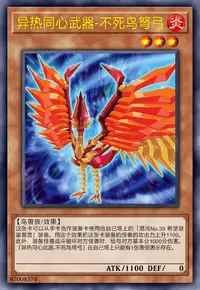 这张卡可以从手卡当作装备卡使用给自己场上的「混沌No.39 希望皇 霍普雷」装备。用这个效果把这张卡装备的怪兽的攻击力上升1100。此外,装备怪兽战斗破坏对方怪兽时,给与对方基本分1000分伤害。「异热同心武器-不死鸟弩弓」在自己场上只能有1张表侧表示存在。