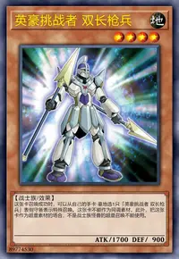 这张卡召唤成功时,可以从自己的手卡·墓地选1只「英豪挑战者 双长枪兵」表侧守备表示特殊召唤。这张卡不能作为同调素材。此外,把这张卡作为超量素材的场合,不是战士族怪兽的超量召唤不能使用。