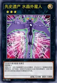 对方场上有怪兽存在,自己场上没有怪兽存在的场合,这张卡可以从手卡特殊召唤。这个方法特殊召唤成功时,可以从自己的手卡·墓地选「先史遗产 水晶骨架」以外的1只名字带有「先史遗产」的怪兽特殊召唤。
