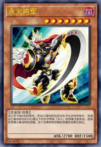 自己手卡是0张的场合,把自己墓地存在的这张卡从游戏中除外,选择自己墓地存在的2只3星以下的名字带有「永火」的怪兽才能发动。选择的怪兽从墓地特殊召唤。这个效果特殊召唤的怪兽的效果无效化。