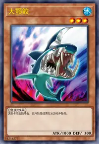 自己场上表侧表示存在的鱼族·海龙族·水族怪兽被选择作为攻击对象时,把墓地存在的这张卡从游戏中除外发动。把1只攻击怪兽的攻击无效,那个攻击力直到下次的自己的结束阶段时下降500。「杀人皱鳃鲨」的效果1回合只能使用1次。