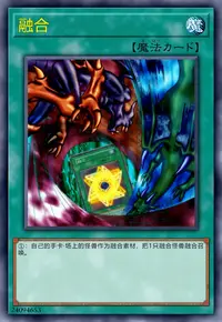 ①:双方玩家在自己主要阶段才能发动。从自己的手卡·场上把融合怪兽卡决定的融合素材怪兽除外,把那1只融合怪兽从额外卡组融合召唤。