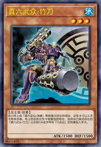 自己场上有「真六武众-竹刀」表侧表示存在的场合,这张卡可以从手卡特殊召唤。此外,1回合1次,可以把这张卡以外的自己场上存在的1只名字带有「六武众」的怪兽解放,选择场上存在的1张卡破坏。