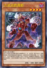 ②:1回合1次,从自己墓地把1只4星以下的「六武众」怪兽除外才能发动。直到回合结束时,这张卡的属性·等级·攻击力·守备力变成和除外的那只怪兽相同。