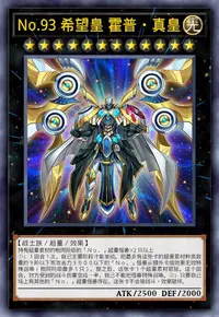 ①:1回合1次,自己主要阶段才能发动。把最多有这张卡的超量素材种类数量的9阶以下而攻击力3000以下的「No.」怪兽从额外卡组效果无效特殊召唤(相同阶级最多1只)。那之后,这张卡1个超量素材取除。这个回合,对方受到的战斗伤害变成一半,自己不能把怪兽特殊召唤。