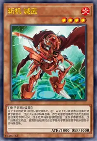 ①:把自己场上1只电子界族怪兽解放才能发动。从卡组把1只「斩机」怪兽特殊召唤。
