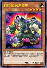 这张卡攻击的场合,伤害步骤内这张卡的攻击力上升400。场上存在的这张卡被破坏送去墓地的回合的结束阶段时,可以从自己卡组把「科技属 突冲犀牛」以外的1只名字带有「科技属」的怪兽加入手卡。