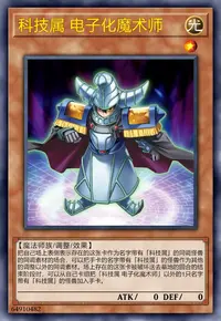 把自己场上表侧表示存在的这张卡作为名字带有「科技属」的同调怪兽的同调素材的场合,可以把手卡的名字带有「科技属」的怪兽作为其他的调整以外的同调素材。场上存在的这张卡被破坏送去墓地的回合的结束阶段时,可以从自己卡组把「科技属 电子化魔术师」以外的1只名字带有「科技属」的怪兽加入手卡。