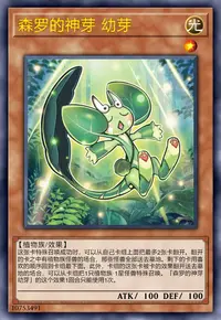 这张卡特殊召唤成功时,可以从自己卡组上面把最多2张卡翻开。翻开的卡之中有植物族怪兽的场合,那些怪兽全部送去墓地。剩下的卡用喜欢的顺序回到卡组最下面。此外,卡组的这张卡被卡的效果翻开送去墓地的场合,可以从卡组把1只植物族·1星怪兽特殊召唤。「森罗的神芽 幼芽」的这个效果1回合只能使用1次。
