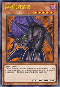 这张卡在墓地存在,自己场上的怪兽被战斗破坏送去墓地时,这张卡可以从墓地特殊召唤。这个效果特殊召唤的这张卡从场上离开的场合从游戏中除外。「异界的棘紫兽」的效果1回合只能发动1次。