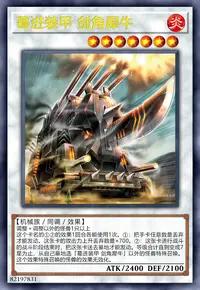 ②:这张卡进行战斗的战斗阶段结束时,把这张卡送去墓地才能发动。等级合计直到变成7星为止,从自己墓地选「蓦进装甲 剑角犀牛」以外的怪兽特殊召唤。这个效果特殊召唤的怪兽的效果无效化。