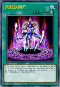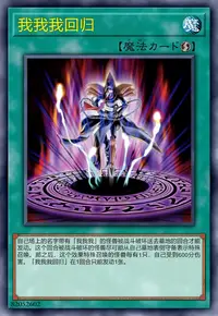 自己场上的名字带有「我我我」的怪兽被战斗破坏送去墓地的回合才能发动。这个回合被战斗破坏的怪兽尽可能从自己墓地表侧守备表示特殊召唤。那之后,这个效果特殊召唤的怪兽每有1只,自己受到600分伤害。「我我我回归」在1回合只能发动1张。