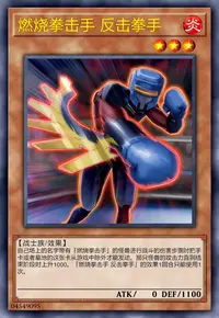 自己场上的名字带有「燃烧拳击手」的怪兽进行战斗的伤害步骤时把手卡或者墓地的这张卡从游戏中除外才能发动。那只怪兽的攻击力直到结束阶段时上升1000。「燃烧拳击手 反击拳手」的效果1回合只能使用1次。