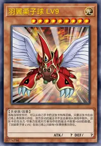 当有连锁发生时,可以从自己手卡把这张卡特殊召唤。只要这张卡在自己场上表侧表示存在,双方发动的魔法卡不送去墓地从游戏中除外。这张卡的攻击力·守备力变成对方墓地存在的魔法卡数量×500的数值。「羽翼栗子球 LV9」在自己场上只能有1张表侧表示存在。