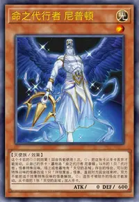 ①:把这张卡从手卡丢弃才能发动。从自己的手卡·墓地选「命之代行者 尼普顿」以外的1只「代行者」怪兽特殊召唤。场上或者墓地有「天空的圣域」存在的场合,可以把特殊召唤的怪兽改成1只「许珀里翁」怪兽。直到对方回合结束时,双方不能把这个效果特殊召唤的怪兽解放。