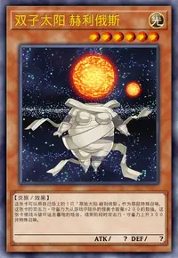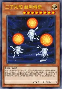 这张卡可以用自己场上的1只「双子太阳 赫利俄斯」作为祭品特殊召唤。这张卡的攻击力·守备力为从游戏中除外的怪兽卡数量×300的数值。这张卡被战斗破坏送去墓地的场合,结束阶段时攻击力·守备力上升500并特殊召唤。对方场上有怪兽存在的场合,只有1次可以继续进行攻击。