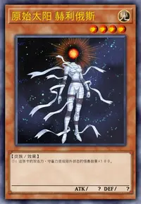 这张卡可以用自己场上的1只「原始太阳 赫利俄斯」作为祭品特殊召唤。这张卡的攻击力·守备力为从游戏中除外的怪兽卡数量×200的数值。这张卡被战斗破坏送去墓地的场合,结束阶段时攻击力·守备力上升300并特殊召唤。