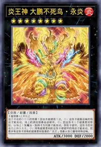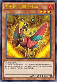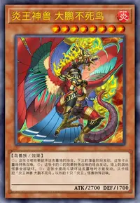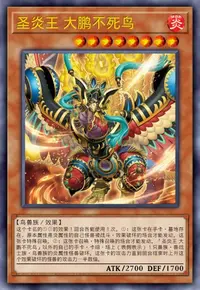 ②:这张卡召唤·特殊召唤的场合才能发动。「圣炎王 大鹏不死鸟」以外的自己的手卡·卡组·场上(表侧表示)1只兽族·兽战士族·鸟兽族的炎属性怪兽破坏。这张卡的攻击力直到回合结束时上升这个效果破坏的怪兽的攻击力一半数值。