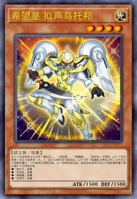 ①:自己主要阶段才能发动。从手卡把「希望皇 拟声乌托邦」以外的以下怪兽各最多1只守备表示特殊召唤。这个效果的发动后,直到回合结束时自己不是超量怪兽不能从额外卡组特殊召唤。