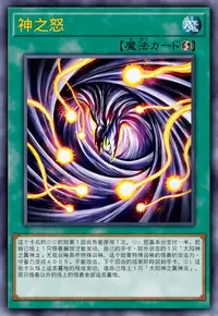 ②:自己场上有「王家的神殿」存在的场合,把墓地的这张卡除外才能发动。从卡组把1张「神之怒」加入手卡。