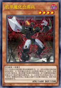 ①:这张卡召唤·特殊召唤成功的场合,以「机甲魔化仓库兵」以外的自己墓地1只「机甲」怪兽为对象才能发动。那只怪兽守备表示特殊召唤。这个效果特殊召唤的怪兽在这个回合不能把效果发动。