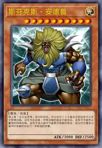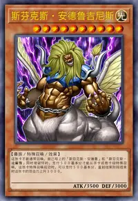 这张卡不能通常召唤。自己场上的「斯芬克斯·安德鲁」和「斯芬克斯·迪蕾雅」同时被破坏时,支付500基本分才能从手卡或者卡组特殊召唤。这张卡特殊召唤成功时,可以支付500基本分,直到结束阶段结束时这张卡的攻击力上升3000。